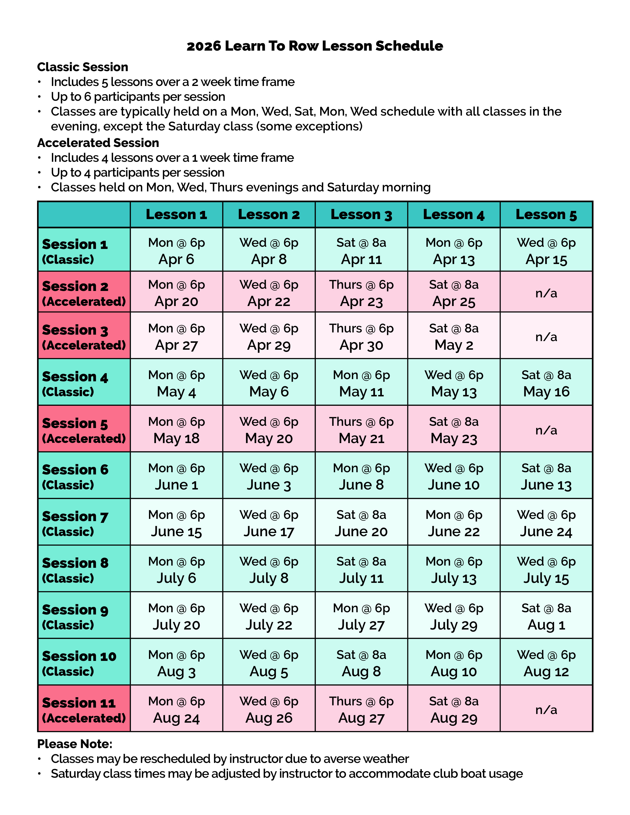 We offer two different formats of Learn To Row lessons to help accommodate various schedules and learning styles: Classic Sessions or Accelerated Sessions.